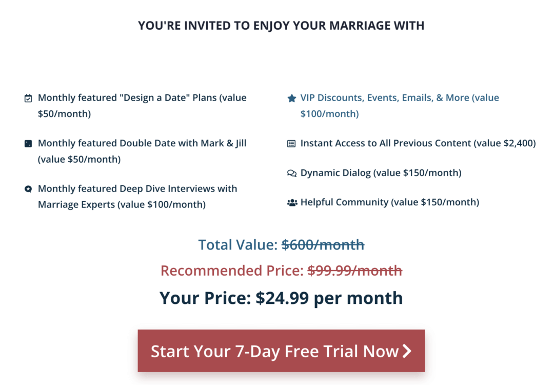 Our No More Perfect Date Night Membership offers new date ideas each month designed to spark laughter, ignite romance, and deepen your connection with your spouse. (Along with many other practical resources each month for your marriage.) Sign up for a FREE 7-Day Trial to see what it’s all about!