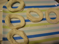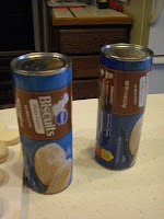 Then open up the refrigerator biscuits. Spread out each biscuit just a little bit on a cutting board. Then cut a hole out of the middle of each biscuit. I use a medicine cup to do this. A cap to a 2-liter bottle could also work.